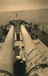 The Zara-class cruisers saw extensive service during World War II, having taken part in several sorties to catch British convoys in the Mediterranean as the flagship of the 1st Division.[12] At the Battle of Calabria in July 1940, torpedo bombers from the British aircraft carrier HMS Eagle attacked the Zara-class cruisers, but they failed to score any hits. The ships steamed ahead to the front of the Italian line of battle and joined the attack on the leading British battleship, Warspite, but they scored no hits. British cruisers attacked as the Italians withdrew, but heavy fire from the Italian cruisers drove them off.[13] All four ships escaped damage at the Battle of Taranto in November 1940.[12] In March 1941 at the Battle of Cape Matapan, Pola was immobilized by a torpedo from a Swordfish torpedo bomber launched by the British aircraft carrier HMS Formidable; Zara and Fiume were detached from the rest of the fleet to protect Pola, and all three and a pair of destroyers were sunk in a close-range night engagement with the battleships Barham, Valiant, and Warspite.[12] Italian casualties were very heavy, with 783 killed aboard Zara, 328 killed aboard Pola, 812 aboard Fiume.[14] The survivors, mostly from Pola, were rescued primarily by British destroyers, though Greek destroyers and an Italian hospital ship picked up others over the following few days.[15][16][17]