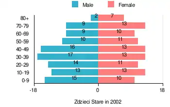According to the 2002 Poland census, there were 206 people residing in Zdzieci Stare village, of whom 51% were male and 49% were female. In the village, the population was spread out, with 21.8% under the age of 18, 37.9% from 18 to 44, 18% from 45 to 64, and 22.3% who were 65 years of age or older.[1]