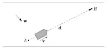 The case of constant wind is easy to solve exactly.[3] Let , and suppose that to minimise the travel time the ship travels at a constant maximum speed . Thus the position of the ship at time is . Let be the time of arrival at , so that . Taking the dot product of this with and respectively results in and . Eliminating and writing this system as a quadratic in results in . Upon solving this, taking the positive square-root since is positive, we obtain