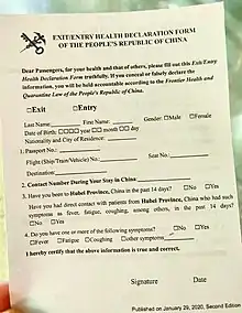 China reported its first imported COVID-19 case from an incoming traveler on 30 January 2020.[69] As the number of imported cases rose and the number of domestic cases fell, China began imposing restrictions on entry into the country.[69] Inbound flights were restricted, and all incoming passengers were required to undergo quarantine.[69]