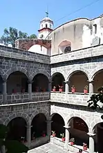 In the 18th century, the residents of this mountain moved to settle alongside the Franciscan monastery established here in the 16th century.[2] This monastery is the best preserved of a network of missionaries established in the Toluca Valley in the mid 16th century. Today, the complex functions as the parish church, with the cloister dedicated as the colonial era museum of the state of Mexico.[3]