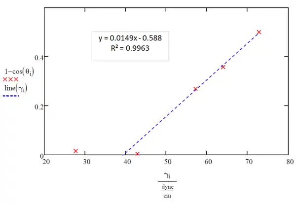 The data of the liquids given from the table above is then graphed on the Zisman Plot (Figure 2) with the independent variable as the surface tension of the liquid in dynes/cm and the dependent variable as 1-cos(θSL). There also are different variations of the Zisman plot since the Y-axis is unitless as seen in Table 1 and as mentioned above.