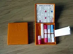 • Противобактериальное средство № 1 (хлортетрациклин 0,006 г.) — 2 пенала без окраски с квадратными корпусами на 5 таблеток каждый;