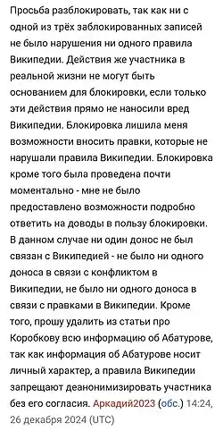 Иван Абатуров был многолетним участником русского раздела Википедии и Викиновостей. Под ником «Аркадий2023» Иван Абатуров в Википедии сам написал статью об «Анне Коробковой», ставшую частью расследования с её разоблачением. Вскоре после выхода расследования Архиповой был заблокирован в Википедии, а 31 марта 2025 года шесть его учётных записей были глобально заблокированы во всех проектах Фонда Викимедиа[2].