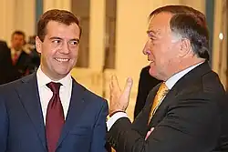 Президент России Дмитрий Медведев беседует с Диком Адвокатом во время встречи с игроками футбольной команды «Зенит» в Кремле (16 мая 2008)