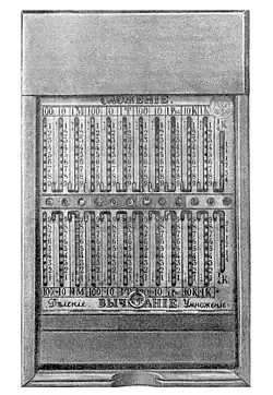 Француз Сезар Казэ[2] в 1707 году придумал рейки, прорези длиной в 10 единиц и метки, указывающие, куда надо вести штырь: вверх или вниз. Перенос в следующий разряд выполнялся вручную. Несмотря на сомнительную полезность, устройство получило определённое распространение.