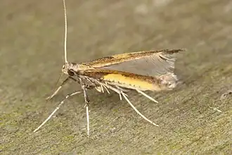 Бабочки размахом крыльев 10-12 мм[2]. Передние крылья тёмно-коричневые с золотисто-жёлтой костальной областью[3].
