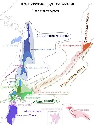 Некогда айны жили также и на территории современной России на Сахалине и Курильских островах, на южной оконечности полуострова Камчатка (от реки Большой на западе и Авачинской бухты на востоке полуострова до мыса Лопатка — эта страна так и называлась «Курильская землица»[6]).