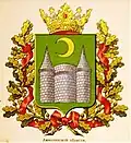 В зелёном щите, серебряный памятник, с двумя остроконечными башнями и куполом в середине, сопровождаемый в главе щита, золотым полумесяцем. Щит украшен древней Царской короной и окружён золотыми дубовыми листьями, соединёнными Александровской лентой