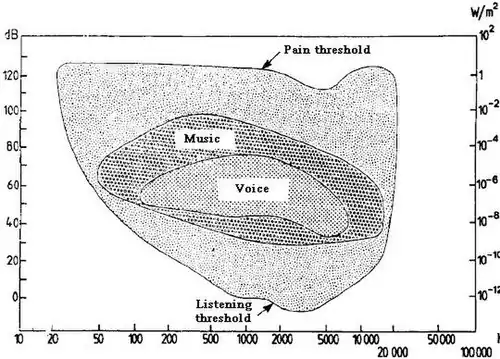 Возмущения в воздухе, определяемые как звук, могут характеризоваться очень широким диапазоном частот и давлений. Однако далеко не все они воспринимаются человеческим ухом. На рисунке выделена та область частот и давлений, в которой человеческое ухо воспринимает звук. В этой области также выделены меньшие области частот и давлений, характерные для речевого общения и пения (англ. voice) и музыкальных произведений (англ. music). Построение границ этой области является результатом усреднения измерения для многих людей. Для каждого конкретного человека могут наблюдаться отклонения в определении области восприятия звуковых раздражений.