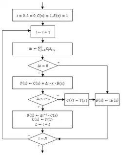 Алгоритм: C(x) инициализирован величиной 1, L обозначает текущее количество найденных ошибок на данный момент, и инициализирован нулём. N — общее количество элементов синдрома ошибки. n — главный счётчик, он же индекс элементов синдрома от 0 до (N-1). B(x) — копия последнего C(x) на момент обновления L, и инициализируется 1. b — копия последнего расхождения d (см.ниже) опять же, на момент обновления L и инициализируется 1. m — номер итераций, прошедших с обновления L, B(x), and b и тоже инициализирован единицей.