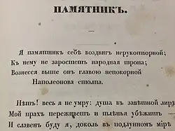 Текст «Памятника» в посмертном сборнике сочинений А. С. Пушкина - ↑ См. обширную подборку Архивная копия от 4 апреля 2018 на Wayback Machine русских переводов и переложений оды Горация.