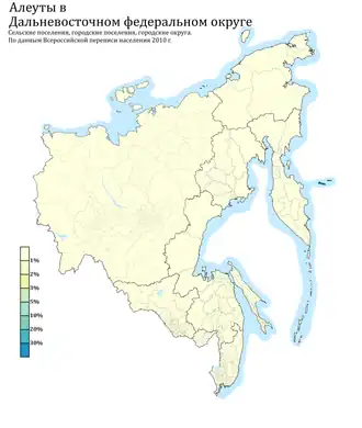 В России живут на Командорских островах, которые составляют Алеутский район Камчатского края. Численность алеутов в России — 482 человека (по переписи 2010 года), из них в крае — 401 чел., где они в основном проживают в селе Никольское — единственном населённом пункте на острове Беринга и во всём районе (с 1970-х годов). Составляют 37,1 % населения Алеутского района по переписи 2010 года.