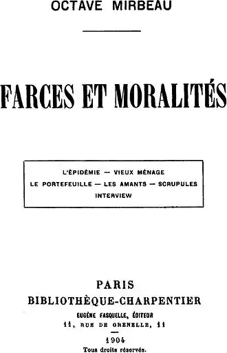В пьесах сборника Фарсы и аллегории, как и в других произведениях, Мирбо развенчивает «ориентиры» современного общества, перед которыми люди слепо преклоняются: закон, лишающий свободы, полицию, распоряжающуюся этим законом произвольно; любовь, оборачивающуюся обманом и надувательством и брак – «болото», в котором оказываются мужчина и женщина; богатство, нажитое нечестным путём, успех в обществе и изнанку высшего света; прессу, ловко скрывающую правду за успокаивающими словами, политиков, которые заботятся только о том, чтобы не потерять своё место.