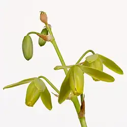 Цветки желтые, дневные, поникающие и обладающие сладким ароматом, напоминающим запах масла и ванили. В теплые солнечные дни запах может быть довольно сильным. Околоцветник около 15-18 мм длиной, желтый с зеленой каймой; внутренние лепестки сводчатые на кончике. Все тычинки фертильные. Столбик имеет призматическую форму и такую же длину, как завязь; рыльце трехстворчатое с тремя длинными тонкими кончиками. Завязь может иметь форму от обратнояйцевидно-эллиптической до шаровидной[3].