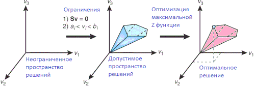 Говорят, что любое , удовлетворяющее уравнению обращает в ноль размерность пространства . Но в любой реалистичной метаболической модели количество реакций всегда больше, чем количество метаболитов (n > m). Другими словами, количество неизвестных больше, чем количество уравнений, следовательно, не существует однозначного решения такой системы, причем многие решения могут быть совершенно неподходящими с биологической точки зрения. Однако пространство решений можно ограничить, и искать решение, отвечающее некоторому критерию. Этот критерий задается так называемой целевой функцией, которая отражает некоторый параметр системы, и ищут решение, при котором эта функция имеет, например, максимальное значение. Кроме того, пространство решений сильно ограничивается наложением ограничений на каждый поток. Таким образом, например, можно рассчитать какая точка в пространстве решений соответствует максимальной скорости роста или максимальному выходу АТФ в определённом организме исходя из наложенных ограничений. (Рис. 1)