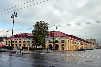 Рынок в сей части есть четвероугольное место по южной стороне большой перспективы, между 5 и 6 линиями. В 1721 году построены были на оном вдоль по перспективе два ряда деревянных лавок; прочее же место было частью болотисто и неравно. С 1789 года вместо деревянных лавок построены каменные таким образом, что они по перспективе делают большой и улицею разделяемый четвероугольник, так что одна часть оного стоит по 5, а другая по 6 линии. Сии лавки расположены подобно прочим новым рынкам, имея внизу аркаду, а сверху кладовые. Выстроенные по 6 линии лавки готовы, кроме штукатурки, а другие не совершенно окончены. А как сей рынок есть единый в сей части города, то и товары в оном различны, и сия пестрота несколько поразительна. Тут можно найти муку, крупу, всякие съестные припасы, масло, деготь, смолу, материи, табакерки, ленты, веревки, лошадиную сбрую, старый и новый домашний скарб, свечи, фаянсовую посуду, простые горшки и прочее. На пустом же месте подле лавок продаются сено и дрова.