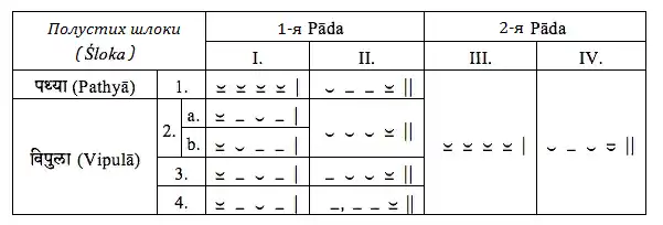 К 5 веку н.э. в поэзии Калидасы шлока имела ограниченную форму, показанную в таблице выше. Каждая половина стиха из 16 слогов может принимать либо форму pathyā («нормальная»), либо одну из нескольких форм vipulā («расширенная»). Полустихи pathyā и vipulā расположены в таблице выше в порядке частоты встречаемости. Наиболее распространенной является патья. Из 2579 половинок стихов, взятых у Калидаса, Бхарави, Магхи и Билханы, каждая из четырех допустимых форм шлоки имеет следующую долю: 2289, 116, 89, 85;[2] то есть, 89% из полу-стихов имеют правильную форму pathyā.
