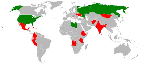 Операторы Ан-32 (страны, в которых Ан-32 эксплуатируется только гражданскими авиакомпаниями, выделены зелёным цветом)