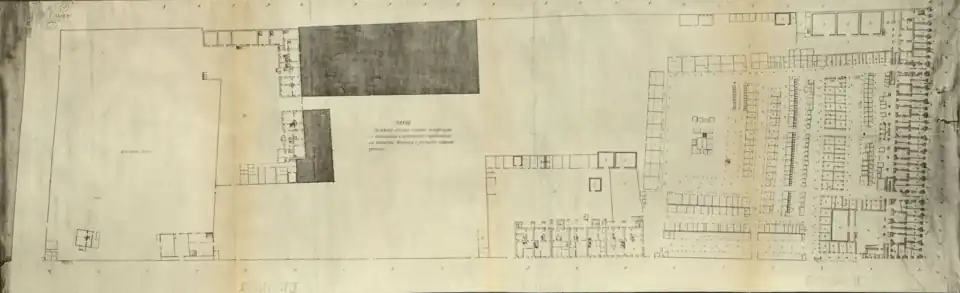Апраксин двор застраивался около двух десятилетий. План Корсини предусматривал застройку территории рядами однотипных зданий по модели корпусов 1810-х годов. Торцы корпусов за Александровской линией соединяются полуциркульными арками, предполагается попарно возвести между ними остеклённые галереи. В 1860-е годы строительством наряду с Корсини занимались Григорий Карпов, Николай Гребёнка, Александр Климов, в 1870-е — Людвиг Фонтана, Андрей Бертельс[21]. Толкучий двор был перенесён на построенный в конце десятилетия Ново-Александровский рынок. В 1866 году на территории Апраксина двора также была открыта названная в честь Осипа Комиссарова бесплатная школа[24], в которой преимущественно обучались дети ремесленников[32].