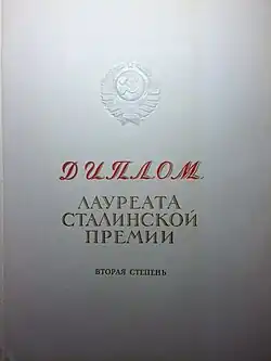 - Сталинская премия за выдающиеся изобретения и коренные усовершенствования методов производственной работы (1943)