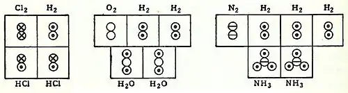 Исходя из этих взглядов, в своей знаменитой статье 1916 года «Атом и молекула» Льюис ввел «структуру Льюиса» для представления атомов и молекул, где точки представляют электроны, а линии — ковалентные связи. В этой статье он разработал концепцию электронно-парной связи, в которой два атома могут делиться от одного до шести электронов, образуя таким образом единственную электронную связь, одинарную, двойную, или тройную связь