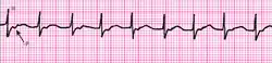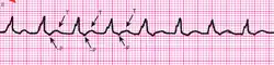 Электрокардиограмма при антидромной АВ-реципрокной (круговой) пароксизмальной тахикардии при синдроме WPW. Отрицательные зубцы P расположены позади широких (сливных) комплексов QRS.