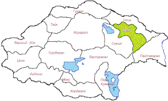 Административно-территориальное деление Великой Армении. Выделен ашхар Арцах. Слева от него — озеро Севан. Внизу слева — озеро Ван. Внизу справа — озеро Урмия. Выделенная синим цветом граница справа — побережье Каспийского моря. Современная Республика Армения располагается е основном на части территорий ашхаров Айрарат, Сюник и малой части ашхаров Гугарк и Утик.