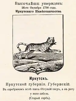 В официально утверждённом Императрицей Всероссийской Екатериной Второй 26 октября 1790 года гербе Иркутска изображен тигр с соболем в зубах со следующим описанием (дословно): «В серебряном поле щита бегущий тигр, а в роту у него соболь. Сей герб старый»[4].