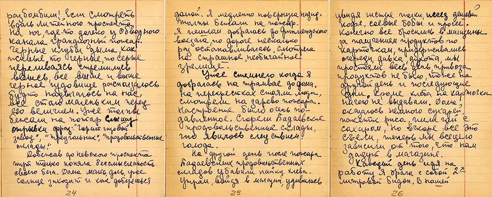 …Когда всё кончилось, мы увидели клубы дыма, занимавшие полнеба. Это горели Бадаевские продовольственные склады. Тогда мы ещё не могли знать, что этот пожар решит судьбу миллиона жителей города, которые погибнут от голода зимой 1941—1942 годов…
