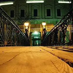 Покрытие прохожей части — двойной дощатый настил, из шпунтованной доски толщиной 40 мм. Доски нижнего настила располагаются поперек оси пролётного строения, доски верхнего настила – вдоль данной оси[2]:37. Перильное ограждение чугунное художественного литья, представляет собой полукруглые секции с радиально расположенными стержнями, связанными фигурными вставками[11]. Рисунок ограждения напоминает перила Демидова моста. У входов на мост на чугунных пьедесталах установлены скульптуры крылатых львов. Крылья грифонов и некоторые детали моста покрыты позолотой. На головах скульптур закреплены светильники в виде усеченных шаров из молочного стекла с верхней литой орнаментальной крышкой из бронзового сплава[13].