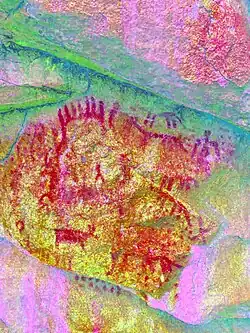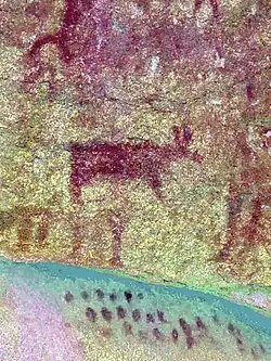 На 15 плоскостях нанесены изображения животных, антропоморфных, зоопоморфных и зооантропоморфных фигур, X- образных знаков, точек, сплошных линий, птиц и скоплений округлых пятен. Антропоморфные фигурки выполнены в традиционной манере, объемно, расположены в фас и профиль[1].