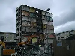 | Башня Пирса | 1 | Построена в 1966 году. Башня была наполовину построена, когда началось строительство следующей. | 1 | Разрушена в 2004 году техникой. Первоначально планировалось снести башню управляемым взрывом, но уже было построено много сооружений в непосредственной близости от объекта, и от плана было решено отказаться. В связи с небольшой задержкой, было решено провести традиционный ирландский день поминовения (Wake), участником которого была башня Пирса и её бывшие жители. Организатором мероприятия стала компания Axis Arts[3]. | ||