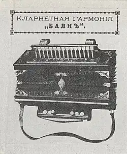 С 1890-х годов баяном называли различные виды гармоник, в том числе диатонические, которые обладали определённым качеством звучания. Их особенностью была чистая унисонная настройка двух или трёх одновременно звучащих язычков[7] (в отличие от настройки в «розлив», характерной для аккордеонов). Так например в 1891 году в рекламном объявлении петербургского магазина А. Е. Кулакова встречается название «Кларнетные гармонии „Баян“» (это была диатоническая однорядная гармоника с тембром похожим на кларнет[1]). Ещё в 1890 годах была популярна «Азиатская гармония „Баян“ с пятнадцатью клавишами и чрезвычайно приятным тоном»[8]. В 1903 году вышел «Новейший практический самоучитель : Для ручной гармонии рояльного (фисгармонного) строя, Вятской, Ливенской и кларнетной „Баян“» (составил С. П. Егоров. г. Рославль)[9].