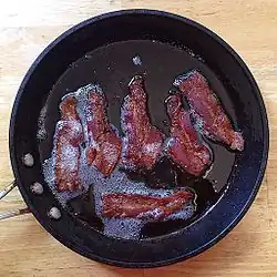Жир бекона при нагревании переходит в жидкое состояние, а при остывании превращается в сало. Он обладает сильным ароматом и используется для различных целей при приготовлении пищи. В британской кухне и кухне южных штатов США жир от бекона используется в качестве основы и как универсальный ароматизатор для всего, от подливки для кукурузного хлеба[46] до заправки для салатов[47].