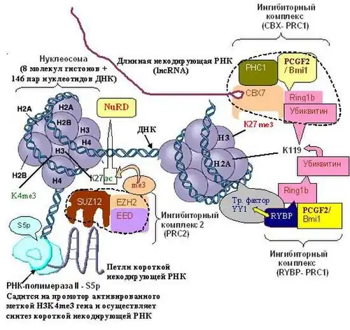 Для того чтобы комплекс PRC2 точно попал на необходимый участок гена-мишени, он должен связаться с короткой некодирующей РНК, которая транскрибируется с 5′-конца гена-мишени, подлежащего репрессии. Помогает посадке комплекса PRC2 на сайты, подлежащие репрессии, очевидно также РНК-связывающий белок RBFox2, поскольку его инактивация приводит к дерепрессии генов[109]. Транскрипцию этой РНК осуществляет РНК-полимераза II- S5p с промотора гена, активированного меткой H3K4me3. Только после того как PRC2 свяжется с этой РНК с помощью его субьединицы SUZ12, он становится способен метилировать лизин 27 гистона Н3 в составе нуклеосомы, контролирующей ген-мишень. Однако для этого лизин 27 предварительно должен быть деацетилирован комплексом NuRD[110][111]. После того как PRC2 с помощью своей субьединицы EZH2 осуществляет тройное метилирование гистона Н3 с образованием H3K27me3, в действие вступает PRC1, который связывается с нуклеосомой либо через «метку репрессии» — H3K27me3, которую узнает его субъединица CBX, либо через один из транскрипционных факторов (REST, YY1 или Runx1/CBFβ).[112] Далее PRC1 закрепляет ингибирование гена, проводя посадку убиквитина на лизин 119 гистона H2A (H2A K119ub).
