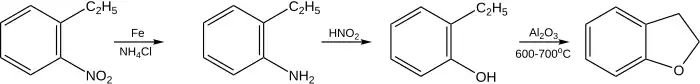 Препаративный синтез бензофурана осуществляется реакцией конденсации салицилового альдегида с хлоруксусной кислотой или этилмалонатом с образованием бензофуран-2-карбоновой кислоты, которую подвергают декарбоксилированию.