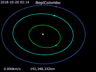 Анимация траектории BepiColombo с 20 октября 2018 года до 2 ноября 2025 года: