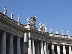 Среди произведений Бернини в тот период нельзя не упомянуть площадь Святого Петра. На широком неупорядоченном пространстве он построил две массивных полукруглых колоннады, каждый ряд в которых состоит из четырёх белых колонн. В результате образовалась арена овальной формы, на которой граждане, гости города и паломники могли стать очевидцами публичного появления папы — в лоджии на фасаде собора Святого Петра или на балконах соседних дворцов Ватикана. Часто сравниваемое с двумя руками, которыми собор охватывает толпу, творение Бернини расширило символическое величие Ватикана, создав «волнующее раздолье» и став, с архитектурной точки зрения, «несомненным успехом»[36][37][38].