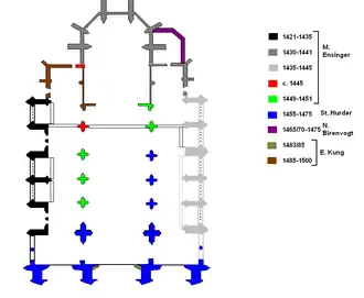 С 1483 года строительством руководил Эрхард Кюнг (Erhard Küng), при нём были достроены стены нефов и нижняя восьмиугольная часть колокольни. После смерти Кюнга в 1506 году, главным мастером стал Петер Пфистер (Peter Pfister), под его руководством до 1521 года был возведён хор, верхняя часть колокольни и почти полностью закончены своды крыши.[3]