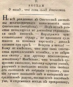 В декабрьском номере «Беседующего гражданина» была опубликована неожиданно острая статья под названием «Беседа о том, что есть сын Отечества», начинавшаяся словами: «Не все рождённые в Отечестве достойны величественного наименования сына Отечества (патриота). Под игом рабства находящиеся недостойны украшаться сим именем».