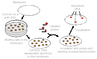 Скрининг (от англ. screening) библиотеки, то есть поиск конкретного фрагмента ДНК среди сотен и тысяч других последовательностей, осуществляют методом ДНК-гибридизации при помощи ДНК-зондов[3]. Если исследователь знает хотя бы небольшую последовательность нуклеотидов с искомого участка, он искусственно синтезирует комплементарную последовательность (праймер длиной около 20 нуклеотидов) и метит её или радиоактивным изотопом, или флуоресцентной меткой. С чашки Петри с колониями посредством блоттинга делают реплику: прикладывают к чашке тонкую нитроцеллюлозную или иную мембрану, на которой остаётся отпечаток всех колоний. После этого осуществляют разрушение бактериальных клеток на отпечатке, освобождение ДНК от белков в щелочной среде и денатурацию ДНК до одноцепочечной молекулы. Далее обрабатывают все колонии зондом и смотрят, в какой из колоний зонд присоединился по принципу комплементарности. Эта колония и будет содержать нужный фрагмент ДНК.
