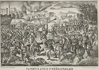 - ↑ Потерпевший сокрушительное поражение Сулейман-паша был арестован и отдан под суд, затем был приговорён к лишению чинов, наград и 15 годам заключения в крепости. Однако вскоре он был помилован султаном и заключение заменено на ссылку.