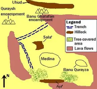 Битва у рва состоялась в месяце шавваль на пятом году хиджры (начало её датируется 31 марта 627 года). Бану ан-Надир и Бану Ваиль пришли к курайшитам-язычникам и призвали пойти войной против мусульман. Также они призвали племя Гатафан. Курайшиты выступили во главе с Абу Суфьяном. Вместе с курайшитами были десять тысяч их рабов-эфиопов, племя Бану Кинана, которое было покорно курайшитам и жителям Тихамы. Мусульман было всего три тысячи. Мухаммад, узнав об этом, решил вырыть вокруг Медины ров. Он сам принял участие в его рытье. Кличем мусульман был: Ха, мим![3] («Они не победят!»)