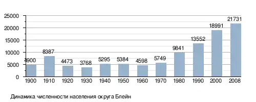 По состоянию на июль 2008 года население округа составляло 21 731 человек[11]. Округ находится на 17-м месте в штате по населению. С 2003 года численность населения увеличилась на 4,82 %[11]. Ниже приводится динамика численности населения округа[11][12][13]. Стоимость жизни в Блейне как популярном курорте выше, чем в окружающих его округах: например, стоимость домов в округе почти вдвое превышает среднюю цену по штату Айдахо[12]. Поэтому многие из тех, кто работает в Блейне, живут в соседних округах, в частности в Шошоне и Линкольне. Так, на 2001 год в основных городах Блейна Сан-Валли, Кетчуме и Хейли работало 1 008 не-резидентов округа[14].