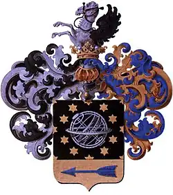 В чёрном щите, усеянном золотыми шестиконечными звёздами, серебряная армиллярная сфера. В золотой оконечности щита лазоревая стрела, обращённая остриём вправо.