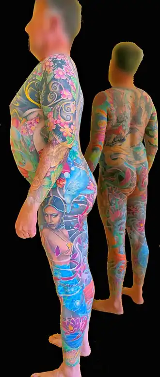 - Татуирование (с полинезийского — «метка») — виды модификации кожи, заключающиеся во вживлении в слои кожи специального красящего пигмента. В отличие от росписи по телу, рисунок сохраняется на всю жизнь. Сюда относятся перманентный макияж, а также, например, косметический татуаж бельма.