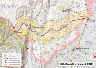 На переговорах 5 марта в Москве президентов России и Турции достигнута договорённость об установлении перемирия в зоне конфликта, с 0:00 часов того же дня; кроме того, создаётся коридор безопасности вокруг шоссе М4 Латакия — Алеппо глубиной в 6 км по обе стороны, а к 15 марта военные двух стран должны договориться о совместном российско-турецком патрулировании в этой зоне[61]. «Хайят Тахрир аш-Шам», которой там формально подчиняются отряды радикальных боевиков-иностранцев, московские договорённости и перемирие не признала и призвала к борьбе. Турецкая армия отводит своё вооружение и военную технику к северу от установленного коридора безопасности; на 11 марта уже отведена треть тяжёлого оружия (при этом, турки не будут выводить тяжёлое вооружение из своих наблюдательных пунктов[62]).