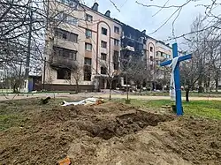 По данным Украины, 10 марта в Буче на территории церкви в братской могиле были похоронены 67 мирных жителей[32]; создание траншеи в дальнейшем было подтверждено спутниковыми снимками Maxar[33].