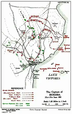 При подходе к Букобе нападавшие случайно попали в большое болото и были прижаты к нему ожесточенным винтовочным и пулемётным огнём с немецких позиций. Однако они смогли выбраться с помощью капитана Майнерцхагена. Британская бомбардировка при поддержке кораблей оказала давление на немецких защитников. Бои в городе продолжились два дня. Около 12:00 23 июня немцы начали отход и организованно отошли к холмам к западу от Букобы. Британцы вошли в город. Австралийский член группы лейтенант Уилбур Дартнел забрался на самый верх ратуши и снял германское императорское знамя как символический жест победы.